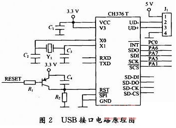 USB接口電路主要由文件管理控制芯片CH376T實現,CH376T支持USB設備方式和USB主機方式,并且內置了USB通信協議的基本固件、處理MassStorage海量存儲設備的專用通信協議的固件、SD卡的通信接口固件、FAT16和FAT32以及FAT12文件系統的管理固件,支持常用的USB存儲設備和SD卡。CH376T支持二種通信接口:SPI接口和異步串口。本設計采用SPI接口與MCU進行數據通信,電路連接方式如圖2所示。串行數據輸入SDI、輸出SDO和時鐘SCK分別接STM32F103VC的SPI1_MOSI,SPI1_MISO和SPI1_SCK,中斷請求輸出端INT接PC0,片選端SCS由PA1控制。圖2中的RESET是系統復位信號,晶體振蕩器Y1選12 MHz。當車主要進行指紋注冊/刪除或應急點火時,將密碼鑰匙(U盤)接入J1以讀取密碼信息。