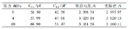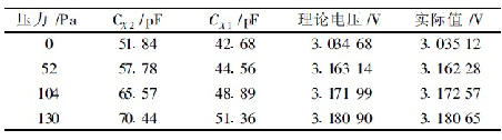 試驗中差動式電容傳感器的低壓端連接CAV424的C X2管腳, 高壓端連接C X1管腳。根據差動電容值的變化范圍, Cosc這里取82 pF, 則fOSC = 29. 036 kH z;GLP = 1 +RL1/RL2中的RL 1, RL2分別取300Ω  和100 Ω , 這樣使得CAV424輸出的電壓范圍在25~3 75 V, 在ADC 模擬輸入范圍內。試驗中選取兩種量程的電容傳感器作為實驗的測試對象, 分別是130 Pa 和10M Pa 兩種。