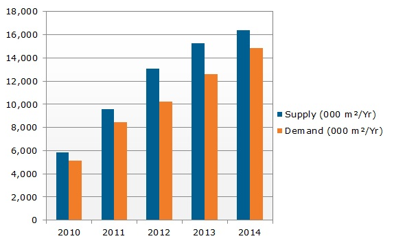 根據NPD DisplaySearch觸控感應器產能統計報告Touch Sensor Manufacturing Capacity指出,2011年主要的觸控傳感器,包含電阻式、投射式電容、單片式投射式電容(sensor-on-cover)和面板內嵌式投射式電容(on-cell)觸控感應器的總產量為960萬平方米,較2010年的580萬平方米取得了66%的年增長率。NPD DisplaySearch預測,2012年觸控感應器將達到1千3百萬平方米,并將于2014年上升到1千640萬平方米。