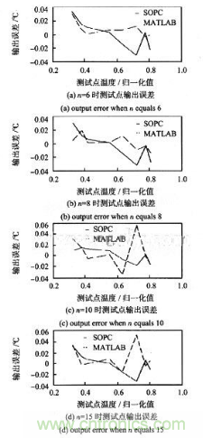 由于采用的是12 bit的A/D轉換芯片,采集數據送入FPGA系統板后,經過歸一化處理,數據類型發生變化。與MATLAB仿真軟件輸出結果保持一致,基于FPGA的神經網絡輸出取小數點后4位有效數字。由圖4可以得出:雖然在個別測試點上基于MATLAB軟件仿真結果優于SOPC的輸出結果,但在隱含層節點對算法性能的影響程度上,基于SOPC技術的輸出受到的影響比較小,穩定性好,這與SOPC技術采用32位字長有很大關系。