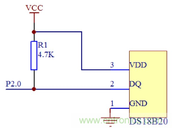 設(shè)計(jì)中采用支持“一線總線”接口、抗干擾性強(qiáng)、外部電路簡(jiǎn)單、精確度高的DS18B20溫度傳感器對(duì)溫度的實(shí)時(shí)測(cè)量。其中,DS18B20 管腳2 即DQ 接在MSP430F149 的P2.0管腳,如圖所示。