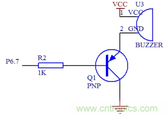 蜂鳴器在微處理器判斷為火災(zāi)時(shí)發(fā)出報(bào)警指示音。由于單片機(jī)的I/O 口驅(qū)動(dòng)能力有限,選用PNP型晶體管2N5401 組成晶體管驅(qū)動(dòng)電路來(lái)驅(qū)動(dòng)壓電式蜂鳴器。