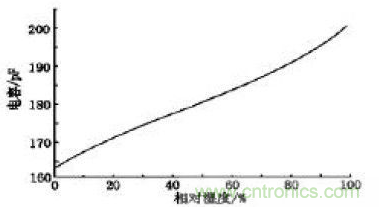 目前, 生產濕敏電容的主要廠家是法國Humirel 公司。它生產的HS1101 測量范圍是0%~100%RH,電容量由162PF 變到200PF,其誤差不大于±2%RH;響應時間小于5S;濕度系數為0.34PF/℃;年漂移量0.5%RH/年,長期穩定。圖1 為HS1101 濕敏電容的濕度-電容響應曲線。