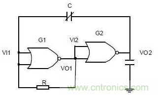 振蕩電路的作用是將電容的變化量轉化為頻率可變的方波。由圖3 可知,這是一個非對稱多諧振蕩器。或非門G1 工作在電壓傳輸特性的轉折區,把它的輸出電壓直接連接到或非門G2 的輸入端。G2即可得到一個介于高低電平之間的靜態偏置電壓,從而使G2 的靜態工作點也處于電壓傳輸特性轉折區上。反饋環路中電容使電路在兩個暫穩態之間往復振蕩。