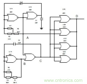 只要調整C 的脈沖寬度,就可以得到D 的脈沖寬度,從而可以消除零點電容,經過調制的電容變化信號也就是濕度信號。將同一封裝內的門電路U2A、U2B、U2C、U2D 并聯使用,可以擴大CMOS 門電路輸出低電平時吸收負載電流的能力。