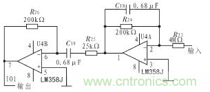0.7 Hz的高通濾波器用來檢測心跳信號,這里采用2個二階壓控高通濾波器串聯形成的四階高通濾波器來構成O.7Hz高通濾波器,其電路如圖6所示。