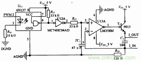 數(shù)據(jù)處理單元具備一路可控4~20 mA的電流輸出,用于現(xiàn)場指示儀表的驅(qū)動。具體的連接電路如圖4所示。其中PWM2連接ARM的PWM2引腳,PWM信號用于控制光耦的導(dǎo)通與截止,反相器主要用于波形的整定,根據(jù)磁敏角度和位移關(guān)系,建立數(shù)學(xué)模型,計算出PWM的占空比,從而達到電流大小調(diào)節(jié)的目的。