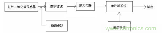 檢測電路由紅外二氧化碳傳感器、數字濾波電路、放大電路、穩流電路、單片機系統、溫度補償等組成。基本原理是紅外二氧化碳傳感器將檢測到的二氧化碳氣體濃度轉換成相應的電信號,輸出的電信號分別經過濾波、放大處理,輸入到單片機系統,并經溫度和氣壓補償等處理后,由單片機系統輸出送顯示裝置顯示其測量值。