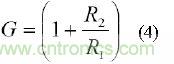 等式(3),R1與R2之比將增益設為: