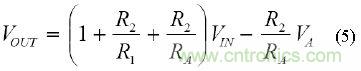 注意,從VA至輸出的增益為反相。VA的增加會使輸出電壓降低,比值為R2和RA之比。此比值下,可以針對給定的輸入失調,使調整范圍達到最大。由于調整范圍指向增益之前的放大器輸入,因此,即使在低分辨率源的情況下,也可實施微調。由于RA一般都比R1大得多,因此,我們可以得到等式(5)的近似值: