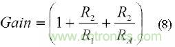 其中, VIN(MAX)為傳感器預期的最大失調。等式(5)同時顯示, 調整電路的插入會修改從輸入到輸出的增益。即使如此,其影 響一般也很小,增益可以重新計算為: