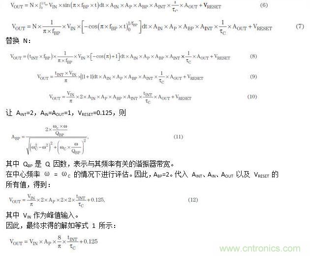 積分器工作從0到B執(zhí)行N次。這將覆蓋輸入的正極。全波整流隨后可通過其它增益系數(shù)進(jìn)行補(bǔ)償。替換VIN,從0到1/fBP積分。