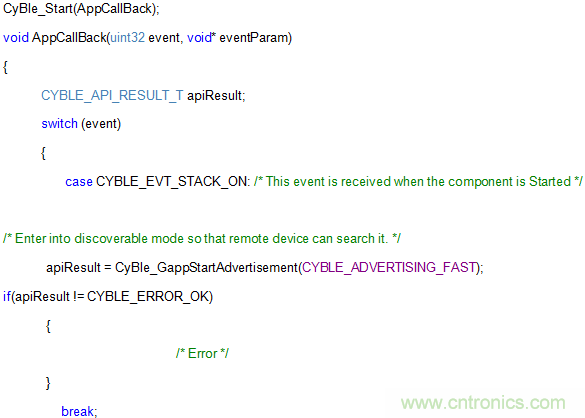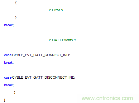 BLE中的一切都作為“活動”處理。BLE堆棧提供處理這些事件的“定義”。以下代碼片段展示了其中一部分活動的運行。