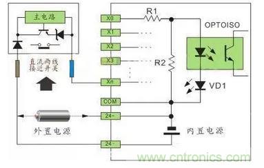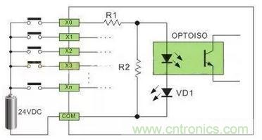 直流電可以由PLC內(nèi)部提供也可以外接直流電源提供給外部輸入信號(hào)的元件。R2在電路中的作用是旁路光電耦合器內(nèi)部LED的電流,保證光電耦合器LED不被兩線制接近開關(guān)的靜態(tài)泄漏電流導(dǎo)通。