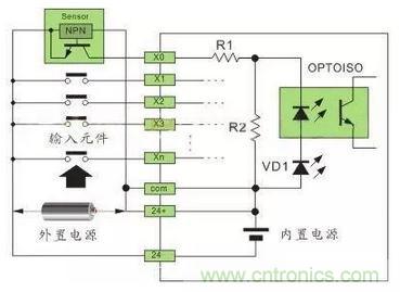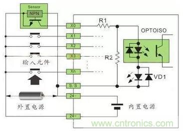SINK輸入方式,可接 NPN 型傳感器,即 X 端口與負(fù)極相連。