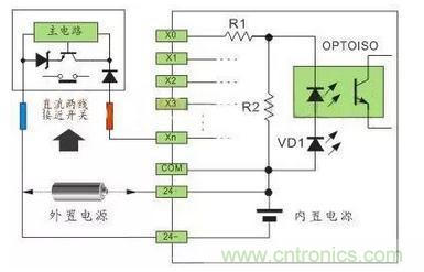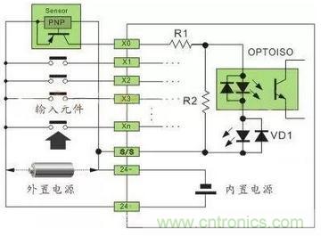 PLC 的數(shù)字量輸入接口并不復(fù)雜,PLC 為了提高抗干擾能力,輸入接口都采用光電耦合器來隔離輸入信號(hào)與內(nèi)部處理電路的傳輸。因此,輸入端的信號(hào)只是驅(qū)動(dòng)光電耦合器的內(nèi)部 LED 導(dǎo)通,被光電耦合器的光電管接收,即可使外部輸入信號(hào)可靠傳輸。