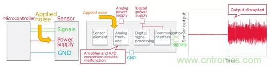 以上這樣,One chip傳感器的信號線或電源線施加噪聲時(shí),會(huì)發(fā)生通信停止或輸出值紊亂的誤操作。