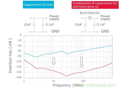 僅使用電容器的情況下,需要低頻端的大容量電容器和為獲得高頻端插入損耗的低ESL電容器。