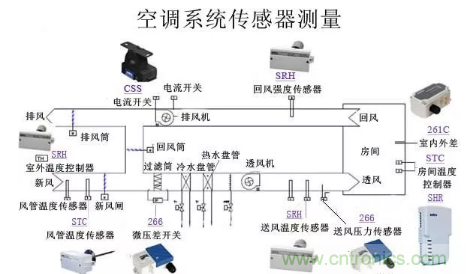 【導讀】以下介紹暖通空調中,完善、全面的空調送風系統傳感器應用原理圖例,以及供熱/制冷系統的傳感測量原理圖。
