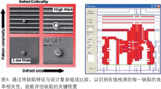 為了提高監測和識別關鍵缺陷的效率,必須采用新方法。依賴簡單的缺陷過濾和基于大小的缺陷次序是不夠的。為了取得最佳的檢測和鑒評預算,必須對檢測設置與鑒評策略二者使用新的知識信息。從設計和模擬得到的關鍵區域和熱點這樣一些知識信息可以插入檢測方略中,優化可用的檢測容量。在完成檢測過程中和完成后,基于多重檢測結果的缺陷過濾和分類使用戶能快速識別新缺陷,有效地量化已知的缺陷類型。利用設計空間中缺陷鄰近位置的信息(此處,設計的復雜組成是了解的),可以較好地評估每一缺陷的良率相關性,提供缺陷的排序(圖4)。